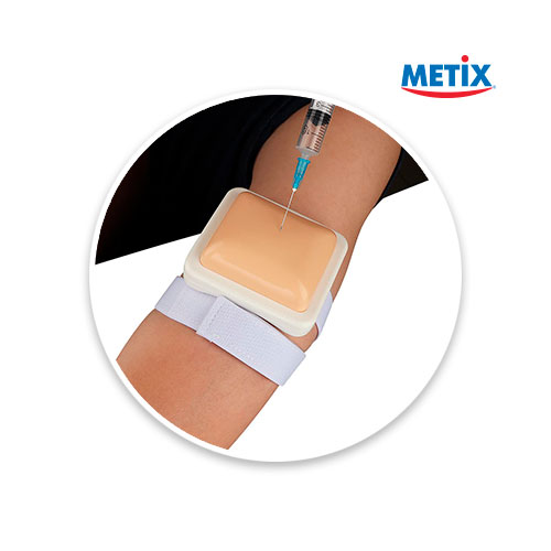DESCRIPCIÓN: El cojín para inyecciones Metix es ideal para el entrenamiento de la inyección para los estudiantes de enfermería.