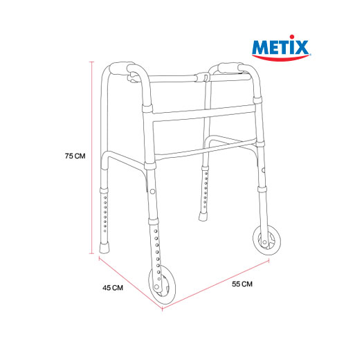 DESCRIPCIÓN: La andadera Sprinter plegable con ruedas Metix proporciona apoyo, equilibrio y seguridad a los adultos que requieren soporte adicional para caminar, ponerse de pie o sentarse. Posee altura ajustable para adaptar a la estatura del usuario y ruedas delanteras para evitar mayor esfuerzo al ser utilizada.