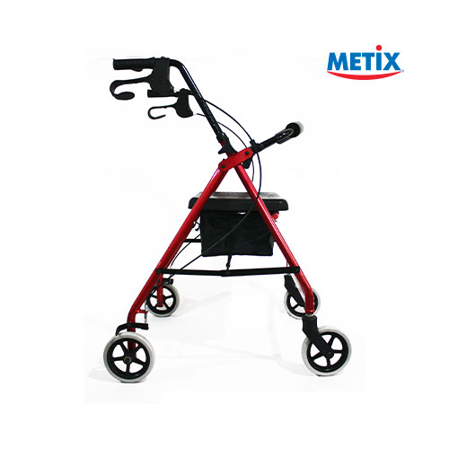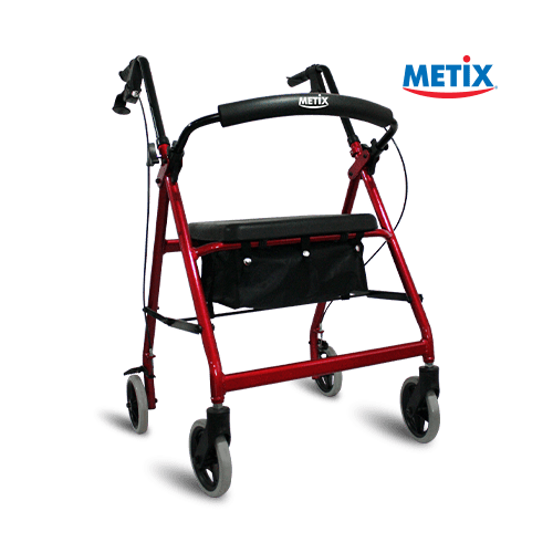 DESCRIPCIÓN: La andadera rollator burgundy Metix es perfecta para brindar autonomía al usuario, se desplaza fácilmente gracias a sus ruedas. Posee asiento para permitir al usario descansar cuando lo requiera y una bolsa debajo para guardar sus pertenencias. Los frenos se encuentran integrados en los manubrios para mayor seguridad.