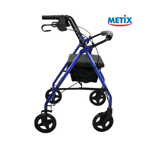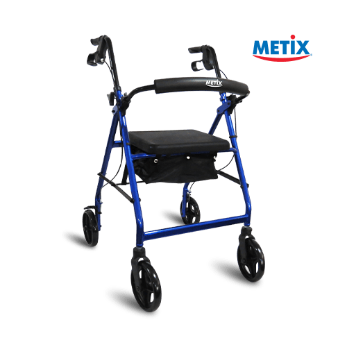DESCRIPCIÓN: La andadera rollator azul Metix es perfecta para brindar autonomía al usuario, se desplaza fácilmente gracias a sus ruedas. Posee asiento para permitir al usario descansar cuando lo requiera y una bolsa debajo para guardar sus pertenencias. Los frenos se encuentran integrados en los manubrios para mayor seguridad.